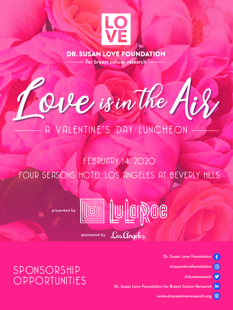 A VALENTINE\'S DAY LUNCHEON FEBRUARY 1 4, 2020 FOUR SEASONS HOTEL LOS ANGELES AT BEVERLY HILLSpresented bysponsored byDr. Susan Love FoundationSPONSORSHIP OPPORTUNITIESdrsusanlovefoundation drloveresearch