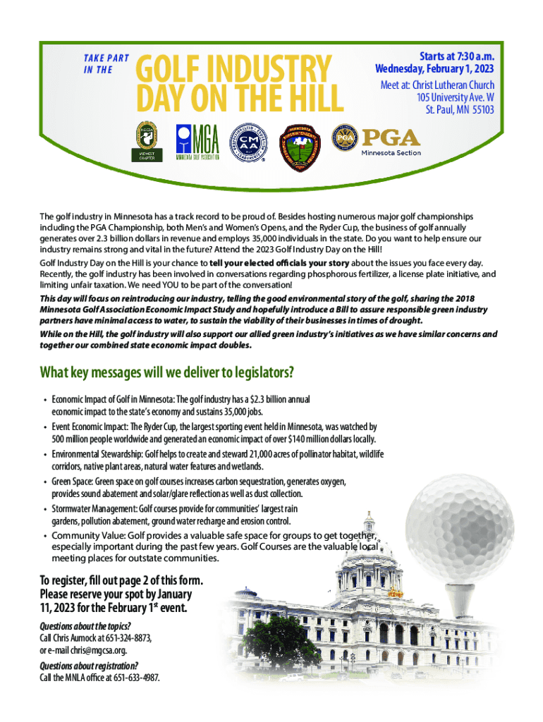 TA K E PA R T IN THEGOLF INDUSTRY DAY ON THE HILLStarts at 7:30 a.m. Wednesday, February 1, 2023 Meet at: Christ Lutheran Church 105 University Ave. W St. Paul, MN 55103The golf industry in Minnesota