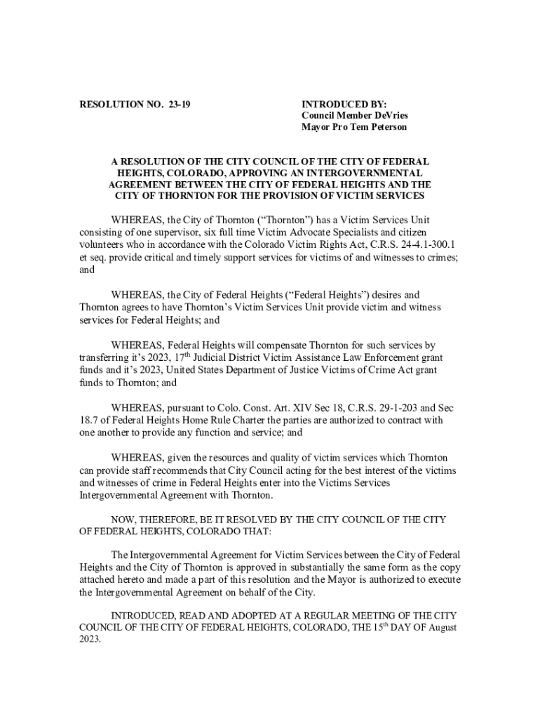 RESOLUTION NO. 2319INTRODUCED BY: Council Member DeVries Mayor Pro Tem PetersonA RESOLUTION OF THE CITY COUNCIL OF THE CITY OF FEDERAL HEIGHTS, COLORADO, APPROVING AN INTERGOVERNMENTAL AGREEMENT BETWEEN