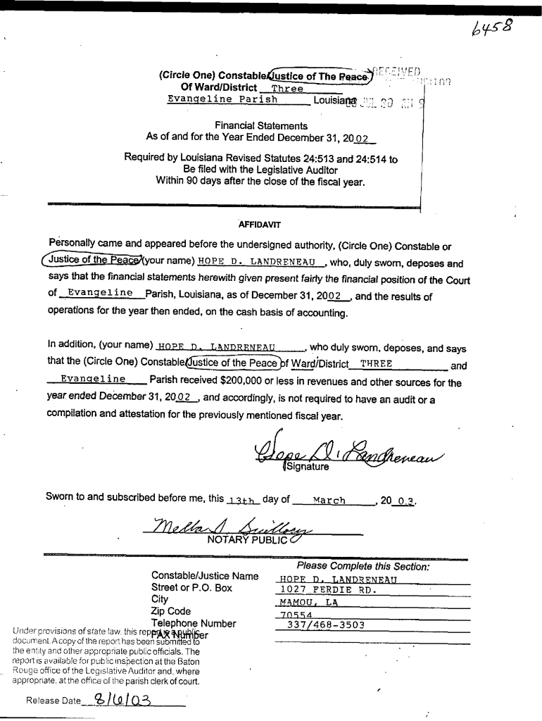 AFFIDAVITPersonally cam e and appeared before the undersigned authority,yourname)HOPE D . LANDRENEU( C i r c l e O n e ) C o n s t a b l e o r ,who,duly sworn,deposes andsays thatt h ef inancialstatem