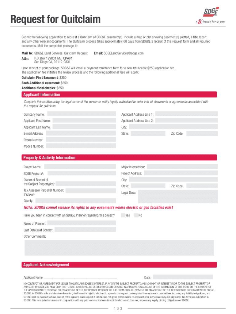 Request for Quitclaim Submit the following application to request a Quitclaim of SDG&E easement(s). Include a map or plat showing easement(s) plotted, a title report, and any other relevant documents.
