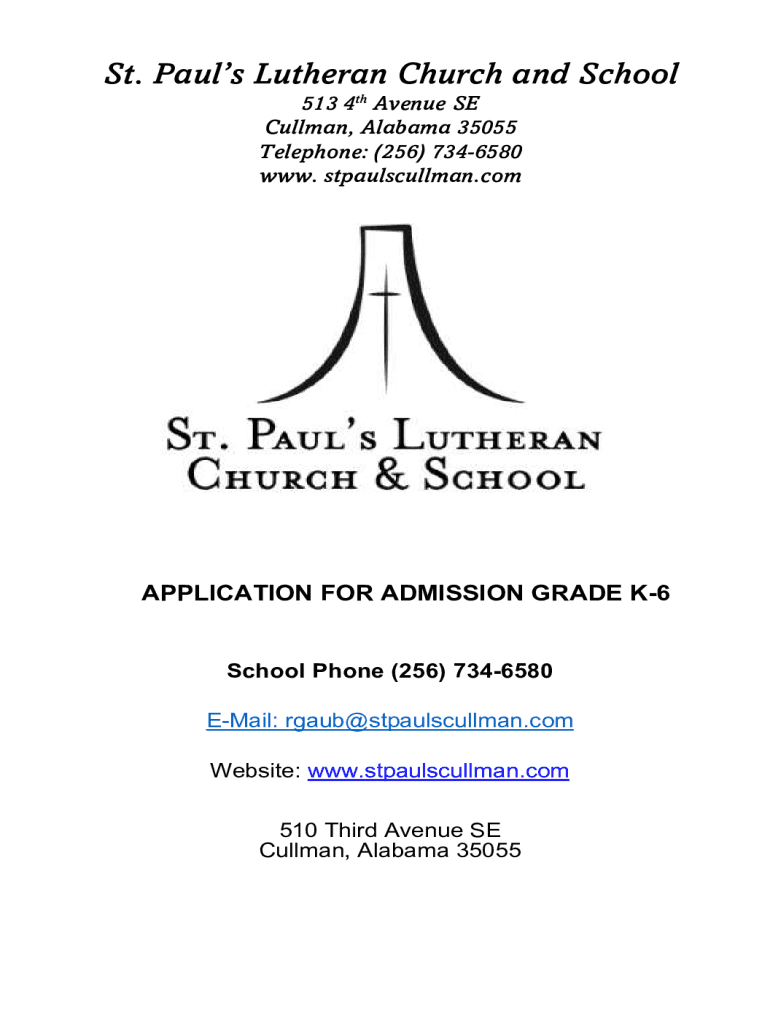St. Pauls Lutheran Church and School 513 4th Avenue SE Cullman, Alabama 35055 Telephone: (256) 7346580 www. stpaulscullman.comAPPLICATION FOR ADMISSION GRADE K6 School Phone (256) 7346580 EMail: rgaub@stpaulscullman.com