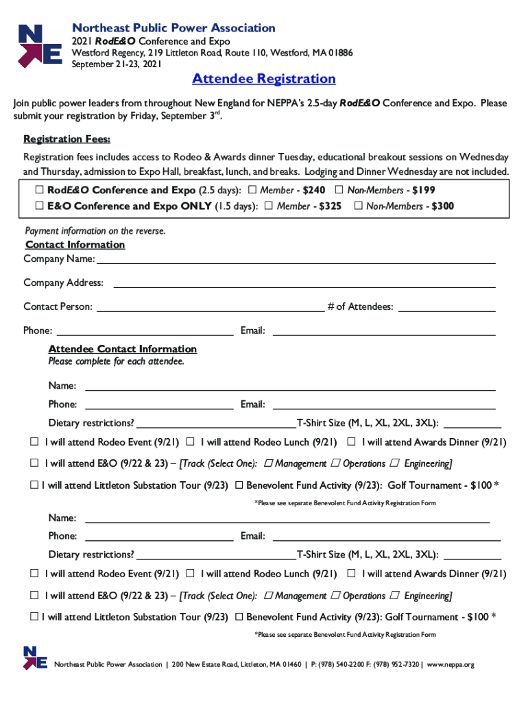 Northeast Public Power Association 2021 RodE&O Conference and ExpoWestford Regency, 219 Littleton Road, Route 110, Westford, MA 01886 September 2123, 2021Attendee RegistrationJoin public power leaders