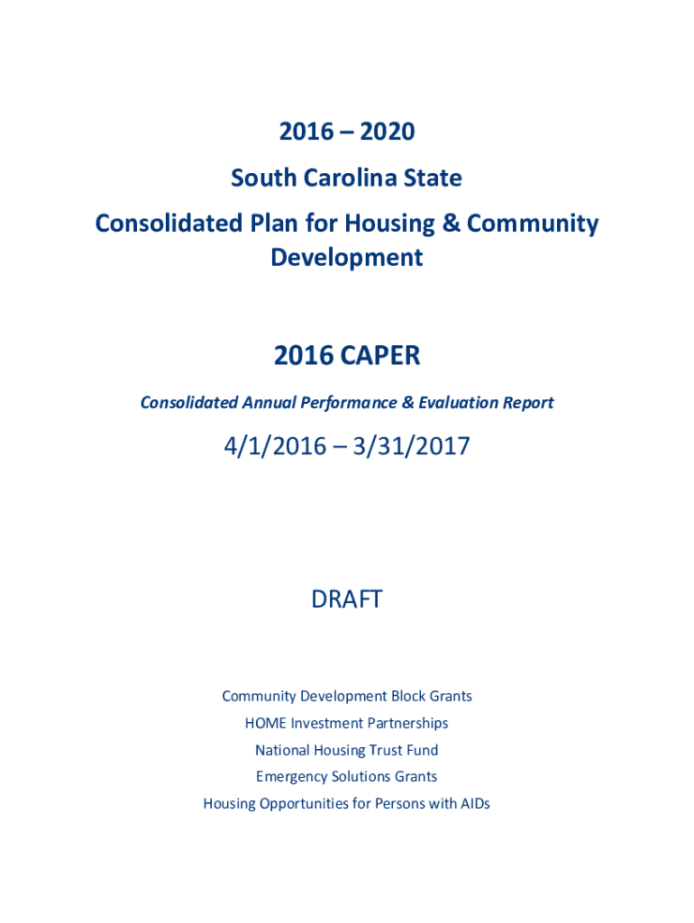 20162020 SouthCarolinaState ConsolidatedPlanforHousing&Community Development 2016CAPER ConsolidatedAnnualPerformance&EvaluationReport4/1/20163/31/2017 DRAFT CommunityDevelopmentBlockGrants HOMEInvestmentPartnerships