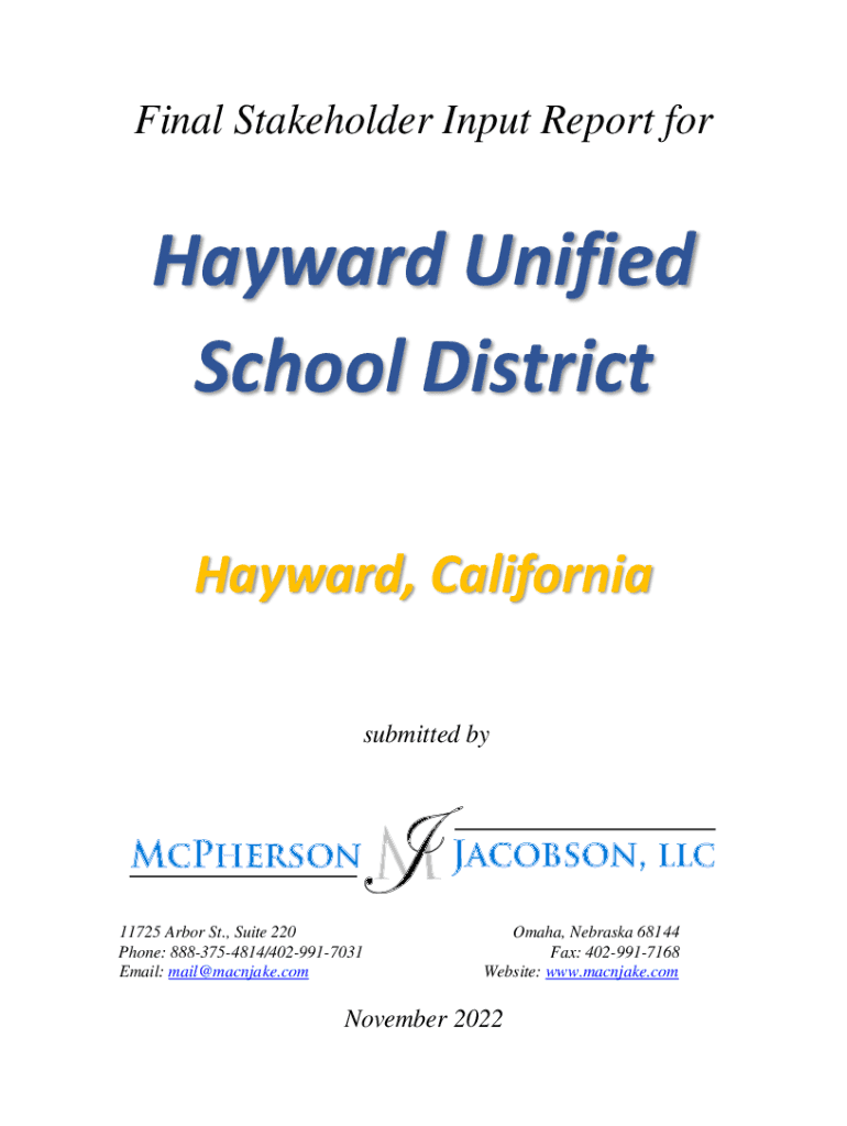 Final Stakeholder Input Report forHayward Unified School District Hayward, California submitted by11725 Arbor St., Suite 220 Phone: 8883754814/4029917031 Email: mail@macnjake.comOmaha, Nebraska 68144