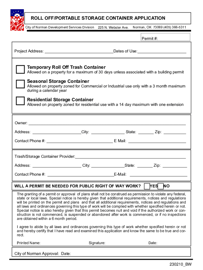 ROLL OFF/PORTABLE STORAGE CONTAINER APPLICATION City of Norman Development Services Division225 N. Webster Ave.Norman, OK 73069 (405) 3665311Permit #: Project Address: ___Dates of Use:___Temporary