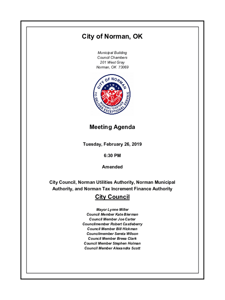 City of Norman, OK Municipal Building Council Chambers 201 West Gray Norman, OK 73069Meeting Agenda Tuesday, February 26, 2019 6:30 PM Amended City Council, Norman Utilities Authority, Norman Municipal