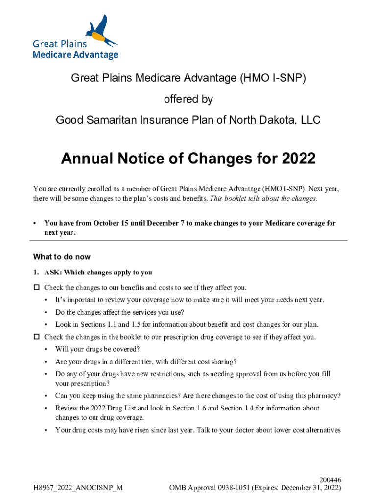 Great Plains Medicare Advantage (HMO ISNP) offered by Good Samaritan Insurance Plan of North Dakota, LLCAnnual Notice of Changes for 2022 You are currently enrolled as a member of Great Plains Medicare