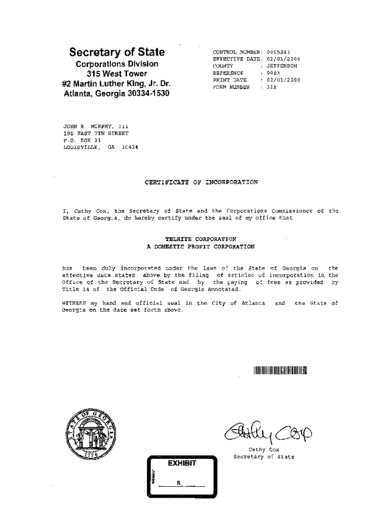 Secretary of StateCONTROL NUMBER: EFFECTIVE DATE: COUNTY REFERENCE PRINT DATE FORM NUMBERCorporations Division 315 West Tower #2 Martin Luther King, Jr. Dr. Atlanta, Georgia 3033415300005243 02/01/2000