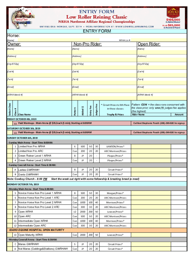 ENTRY FORMHorse: [Name]Owner:NonPro Rider:NRHA Lic #:Open Rider:[City/ST/Zip][City/ST/Zip][City/ST/Zip][Cell #][Cell #][Cell #][Tel #][Tel #][Tel #][Email][Email][Email][NRHA Memb #][NRHA Memb #][NRHA