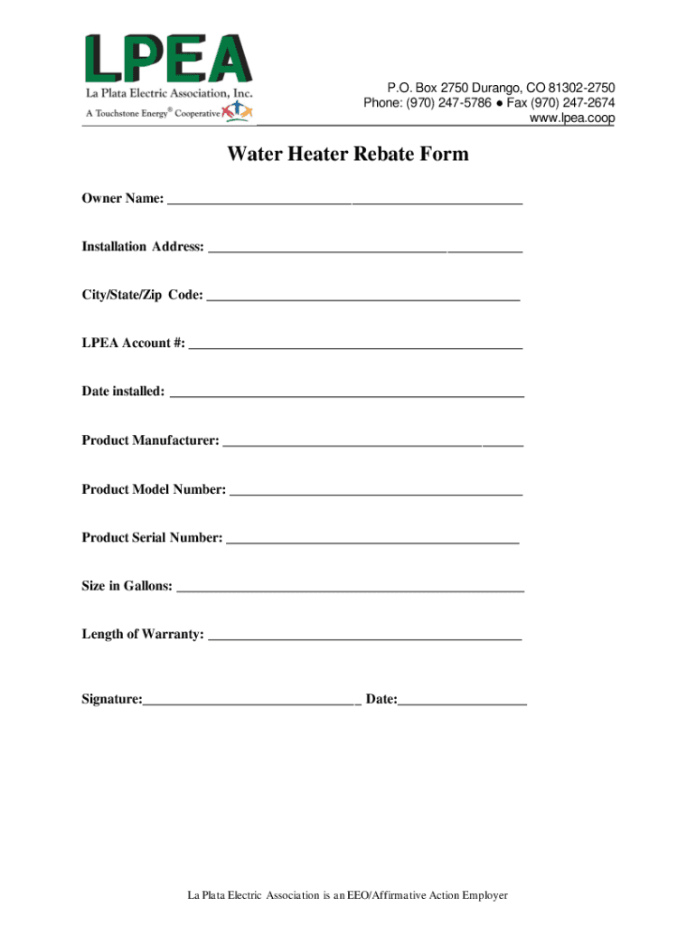 P.O. Box 2750 Durango, CO 813022750 Phone: (970) 2475786 Fax (970) 2472674 www.lpea.coopWater Heater Rebate Form Owner Name: ___Installation Address: ___City/State/Zip Code: ___LPEA Account #: ___Date