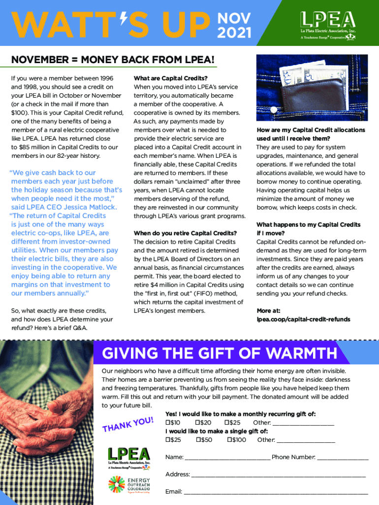 NOV 2021 NOVEMBER MONEY BACK FROM LPEA! If you were a member between 1996 and 1998, you should see a credit on your LPEA bill in October or November (or a check in the mail if more than $100). This