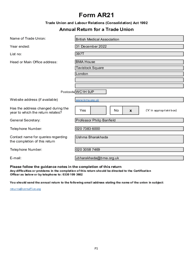 Form AR21 Trade Union and Labour Relations (Consolidation) Act 1992Annual Return for a Trade Union Name of Trade Union:British Medical AssociationYear ended:31 December 2022List no:397THead or Main