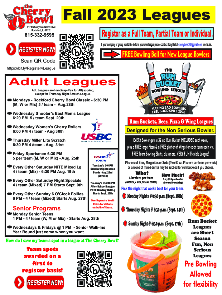 Fall 2023 Leagues 7171 Cherryvale North Blvd Rockford, IL 61112Register as a Full Team, Partial Team or Individual.8153329595If your company or group would like to form your own league please contact