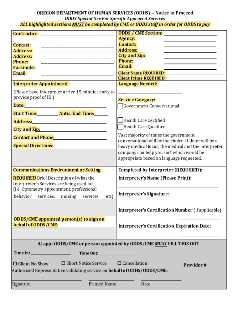 OREGON DEPARTMENT OF HUMAN SERVICES (ODHS) Notice to Proceed ODDS Special Use For Specific Approved Services ALL highlighted sections MUST be completed by CME or ODDS staff in order for ODDS to pay