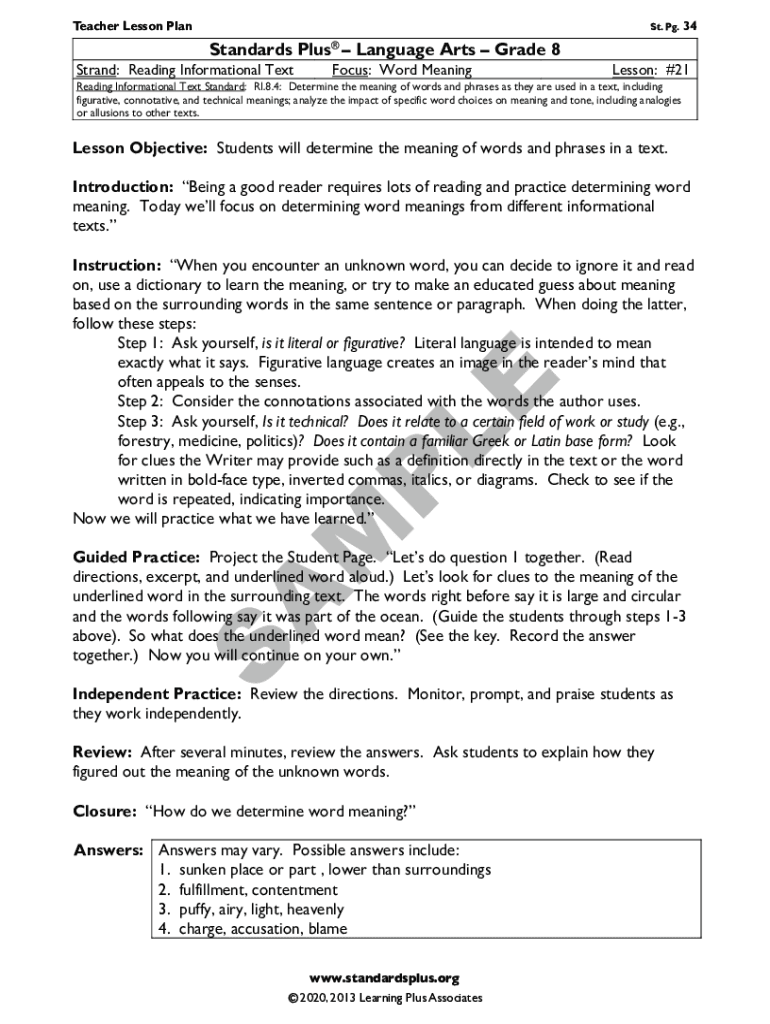 Teacher Lesson PlanSt. Pg.Standards Plus Language Arts Grade 8Strand: Reading Informational TextFocus: Word Meaning34Lesson: #21Reading Informational Text Standard: RI.8.4: Determine the meaning of