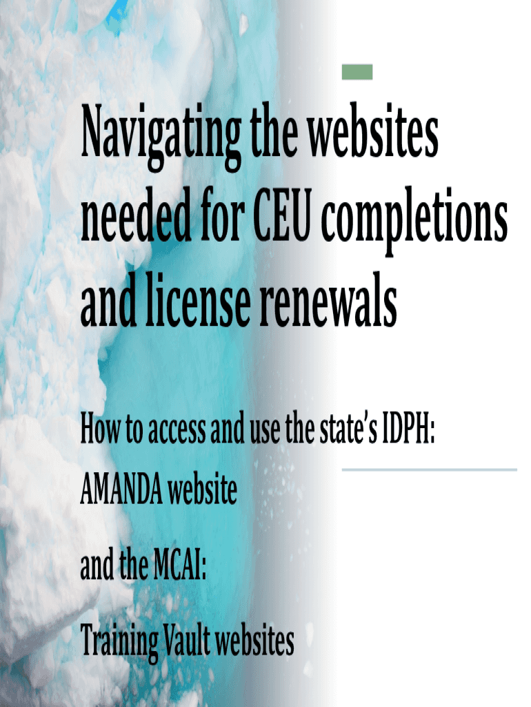 Navigating the websitesneeded for CEU completionsand license renewals How to access and use the states IDPH:AMANDA websiteand the MCAI:Training Vault websitesOn your browser, type:idph regulatory