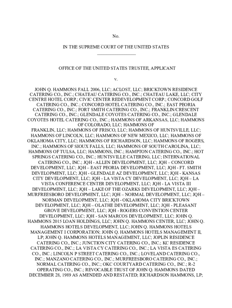 No. IN THE SUPREME COURT OF THE UNITED STATES ___ OFFICE OF THE UNITED STATES TRUSTEE, APPLICANT v. JOHN Q. HAMMONS FALL 2006, LLC; ACLOST, LLC; BRICKTOWN RESIDENCE CATERING CO., INC.; CHATEAU CATERING