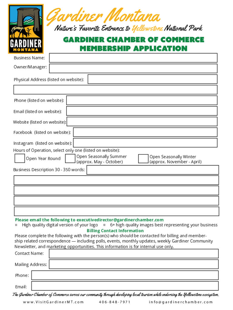 Gardiner Montana Natures Favorite Entrance to Yellowstone National Park 2023 Annual Membership Information & Application Member Benefits Membership Levels Platinum Members $375 annually, entitles