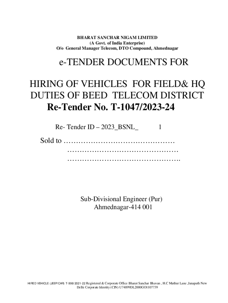 BHARAT SANCHAR NIGAM LIMITED (A Govt. of India Enterprise) O/o General Manager Telecom, DTO Compound, AhmednagareTENDER DOCUMENTS FOR HIRING OF VEHICLES FOR FIELD& HQ DUTIES OF BEED TELECOM DISTRICT