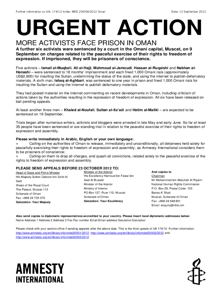 Further information on UA: 174/12 Index: MDE 20/004/2012 OmanDate: 12 September 2012URGENT ACTION MORE ACTIVISTS FACE PRISON IN OMAN A further six activists were sentenced by a court in the Omani