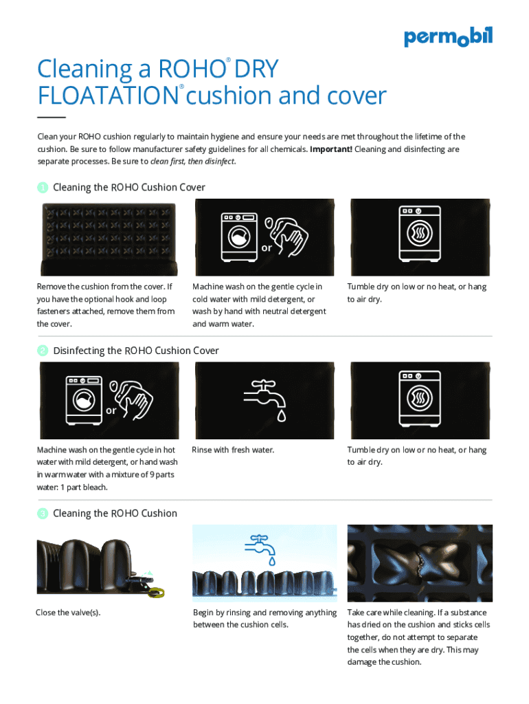 Cleaning a ROHO DRY FLOATATION cushion and cover Clean your ROHO cushion regularly to maintain hygiene and ensure your needs are met throughout the lifetime of the cushion. Be sure to follow manufacturer