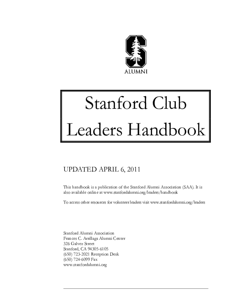 Stanford Club Leaders Handbook UPDATED APRIL 6, 2011 This handbook is a publication of the Stanford Alumni Association (SAA). It is also available online at www.stanfordalumni.org/leaders/handbook