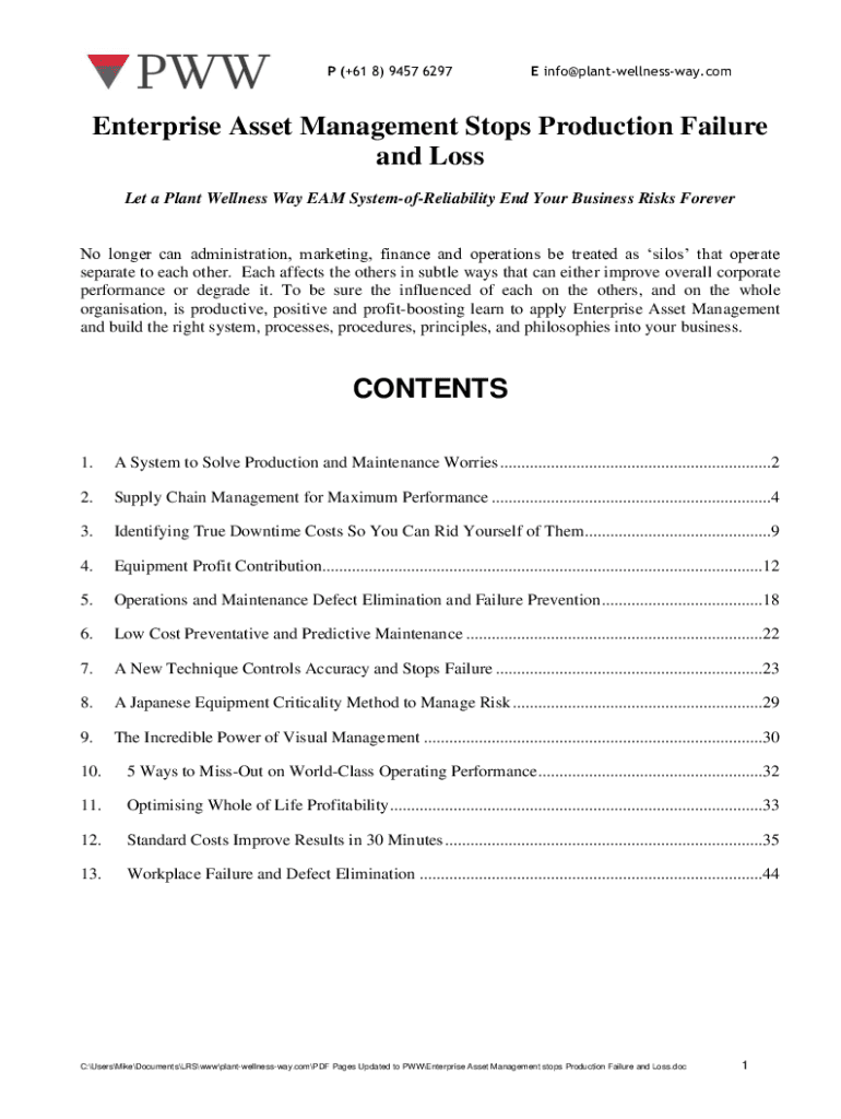 P (+61 8) 9457 6297E info@plantwellnessway.comEnterprise Asset Management Stops Production Failure and Loss Let a Plant Wellness Way EAM SystemofReliability End Your Business Risks Forever No longer