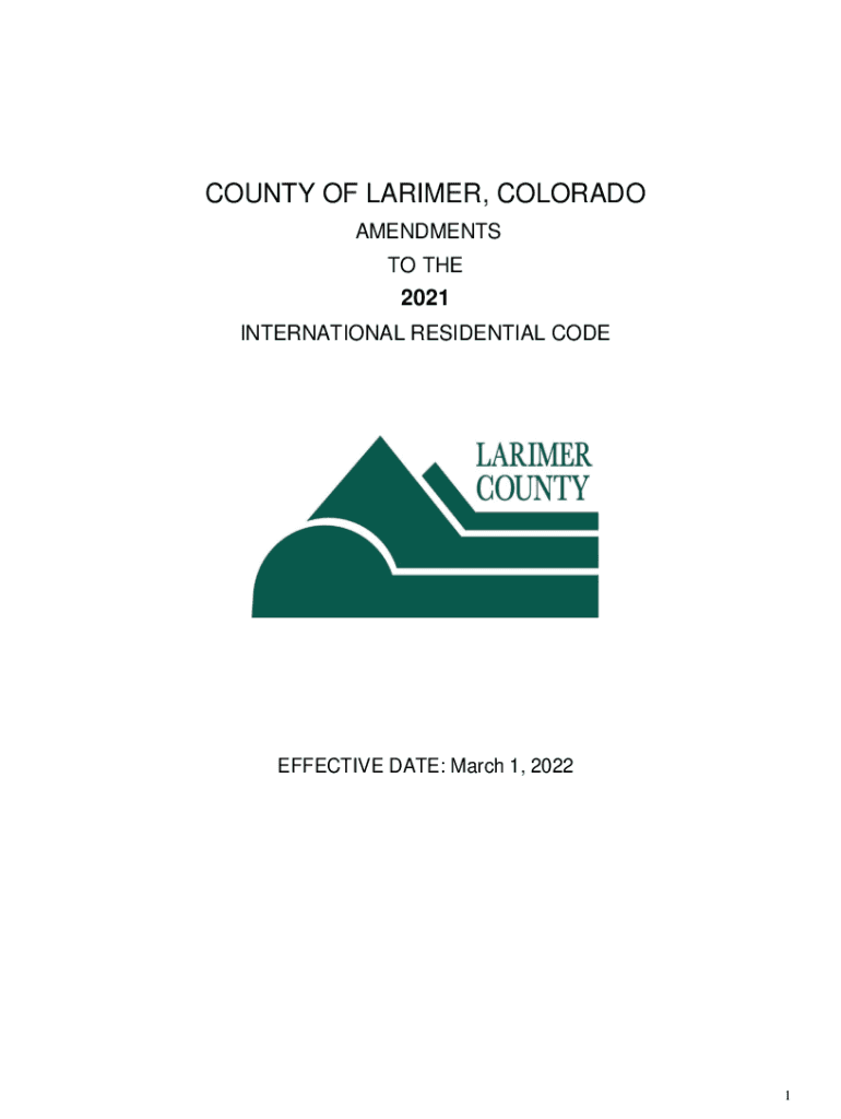 COUNTY OF LARIMER, COLORADO AMENDMENTS TO THE2021 INTERNATIONAL RESIDENTIAL CODEEFFECTIVE DATE: March 1, 20221Amendments to the 2021 International Residential Code WHEREAS, the Chief Building Official