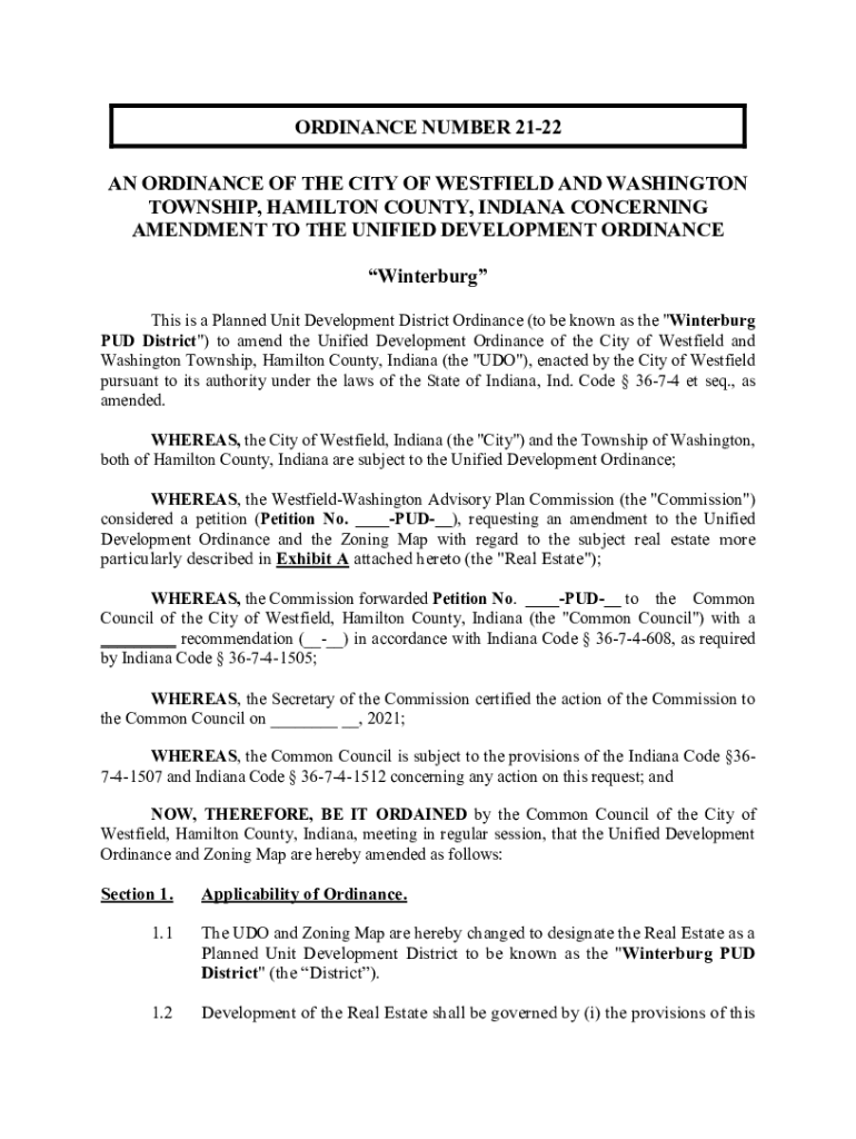 ORDINANCE NUMBER 2122 AN ORDINANCE OF THE CITY OF WESTFIELD AND WASHINGTON TOWNSHIP, HAMILTON COUNTY, INDIANA CONCERNING AMENDMENT TO THE UNIFIED DEVELOPMENT ORDINANCE Winterburg This is a Planned