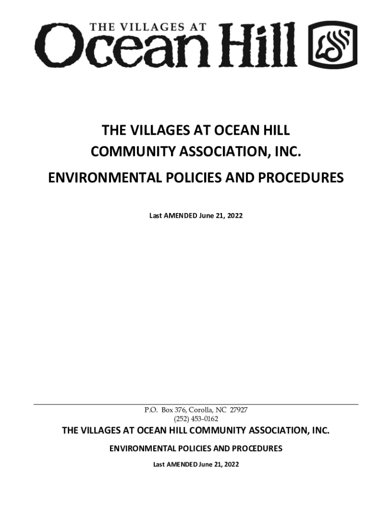 THE VILLAGES AT OCEAN HILL COMMUNITY ASSOCIATION, INC. ENVIRONMENTAL POLICIES AND PROCEDURES Last AMENDED June 21, 2022P.O. Box 376, Corolla, NC 27927 (252) 4530162THE VILLAGES AT OCEAN HILL COMMUNITY