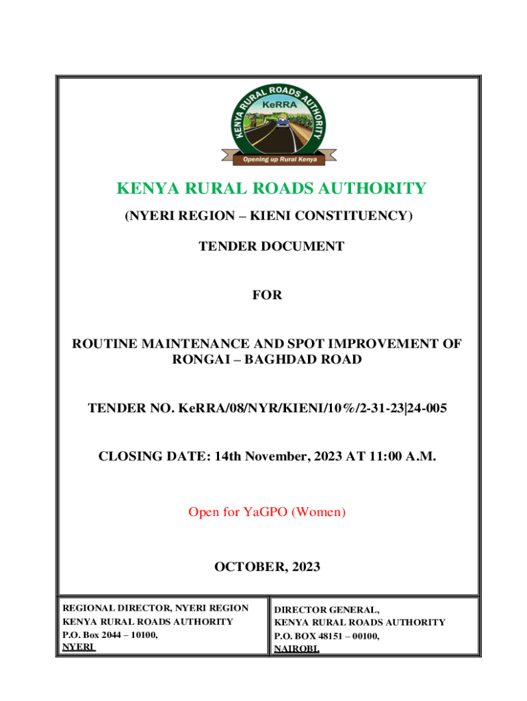 KENYA RURAL ROADS AUTHORITY (NYERI REGION KIENI CONSTITUENCY) TENDER DOCUMENTFORROUTINE MAINTENANCE AND SPOT IMPROVEMENT OF RONGAI BAGHDAD ROADTENDER NO. KeRRA/08/NYR/KIENI/10%/23123|24005CLOSING
