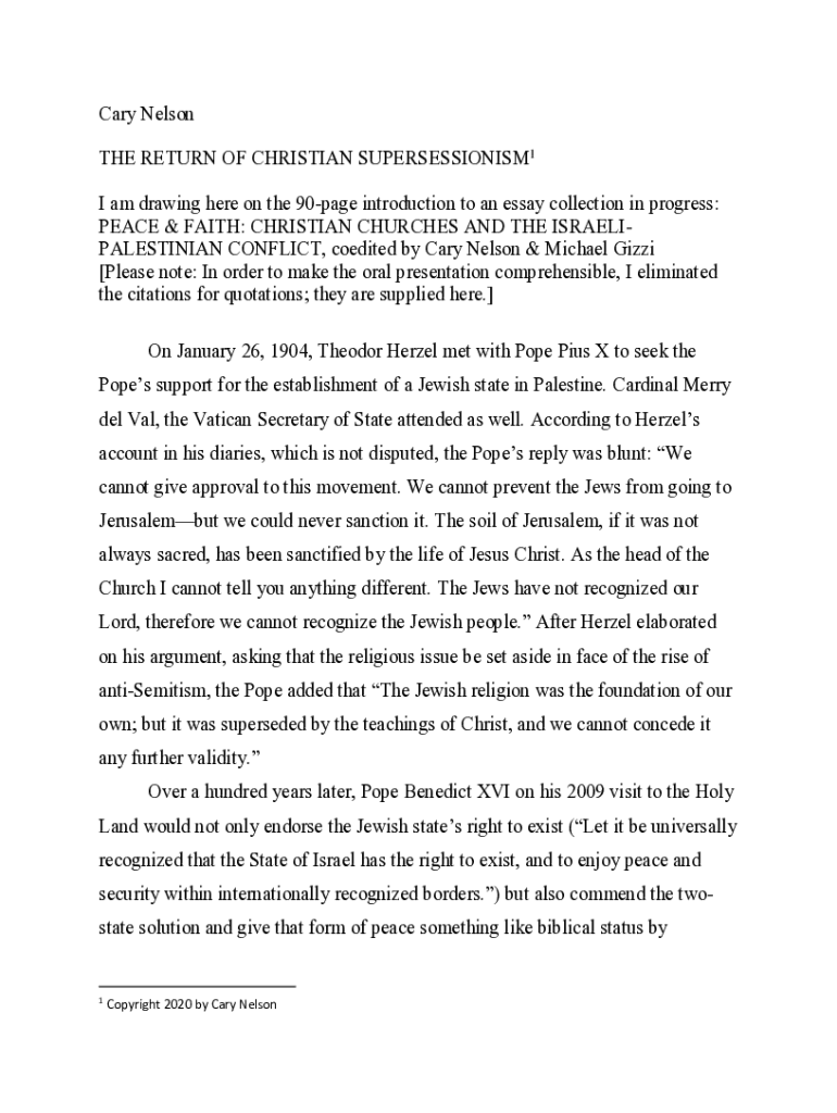 Cary Nelson THE RETURN OF CHRISTIAN SUPERSESSIONISM1 I am drawing here on the 90page introduction to an essay collection in progress: PEACE & FAITH: CHRISTIAN CHURCHES AND THE ISRAELIPALESTINIAN CONFLICT,