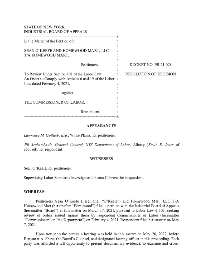 STATE OF NEW YORK INDUSTRIAL BOARD OF APPEALS x In the Matter of the Petition of: : : SEAN OKEEFE AND HOMEWOOD MART, LLC : T/A HOMEWOOD MART, : : Petitioners, : : To Review Under Section 101 of the