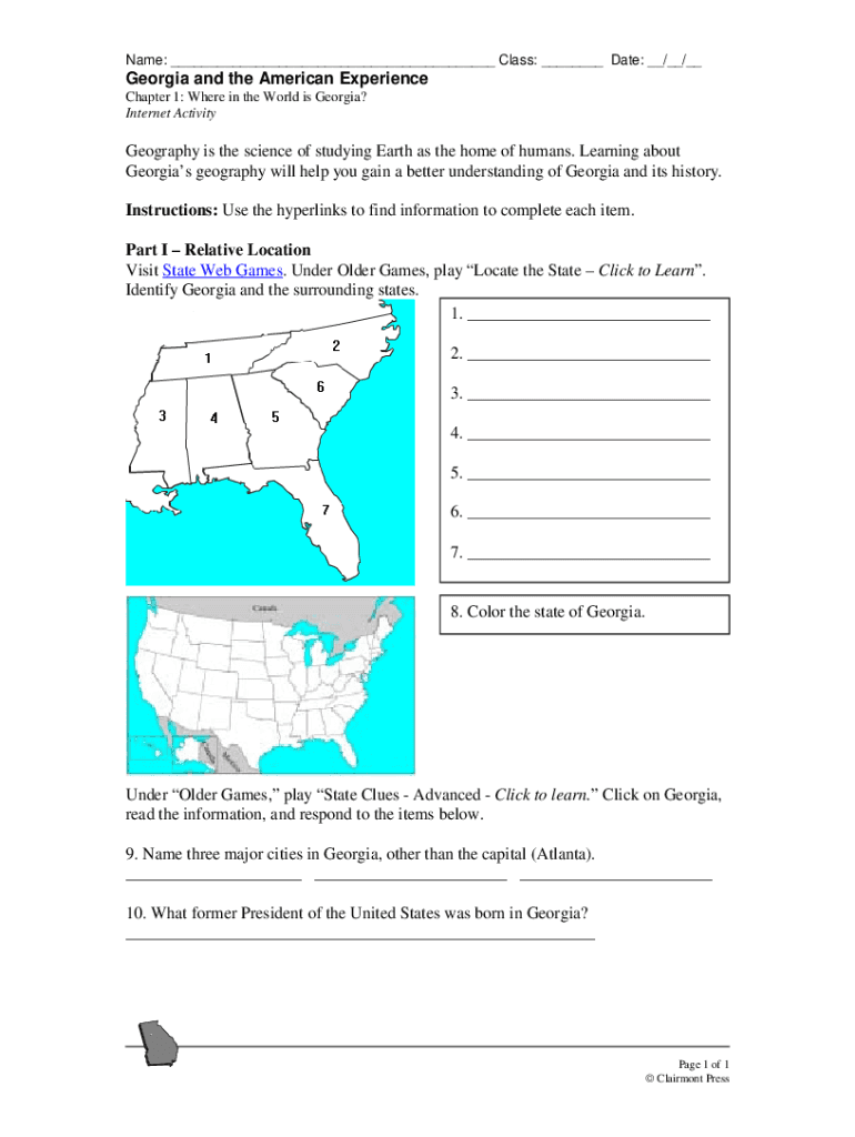 Name: ___ Class: ___ Date: __/__/__Georgia and the American Experience Chapter 1: Where in the World is Georgia? Internet ActivityGeography is the science of studying Earth as the home of humans.