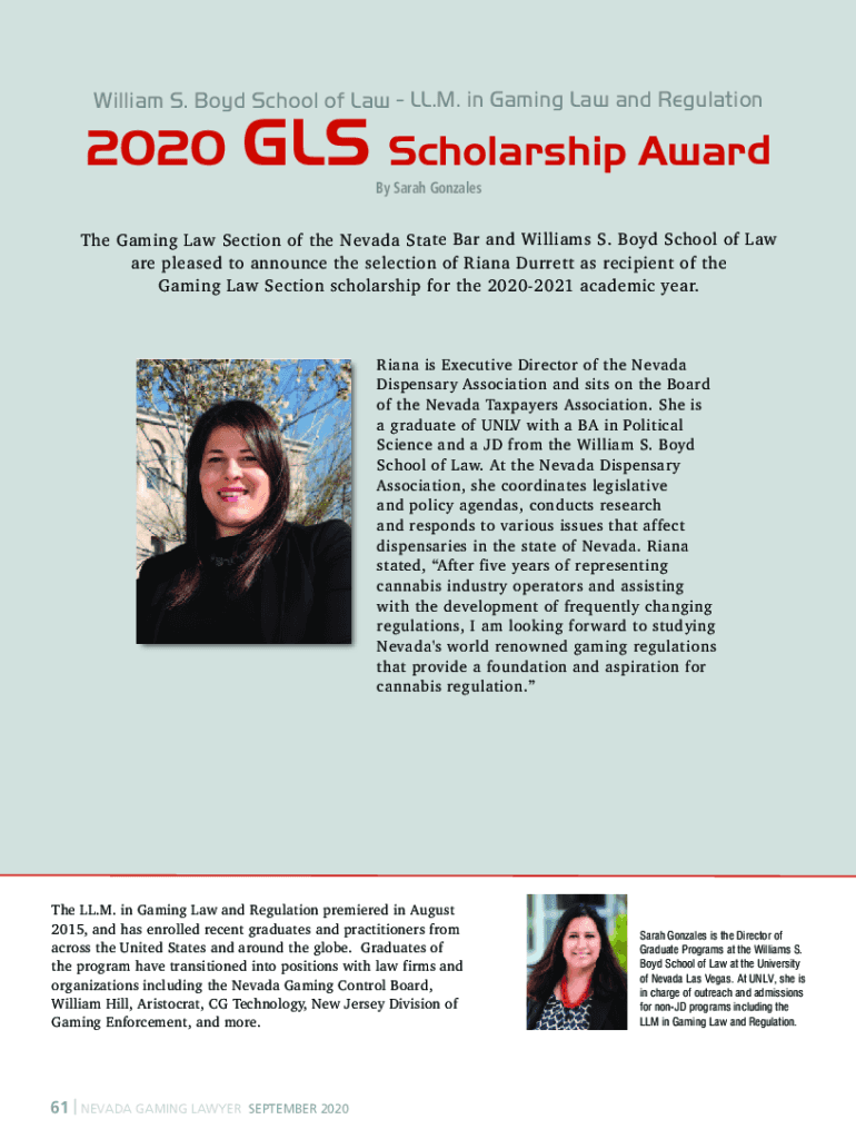 William S. Boyd School of Law LL.M. in Gaming Law and Regulation2020GLS Scholarship Award By Sarah GonzalesThe Gaming Law Section of the Nevada State Bar and Williams S. Boyd School of Law are pleased