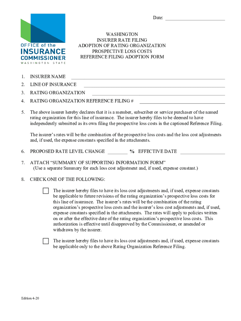 Get the free WA reference filing adoption form. Filing Form used to adopt rating bureau loss cost...