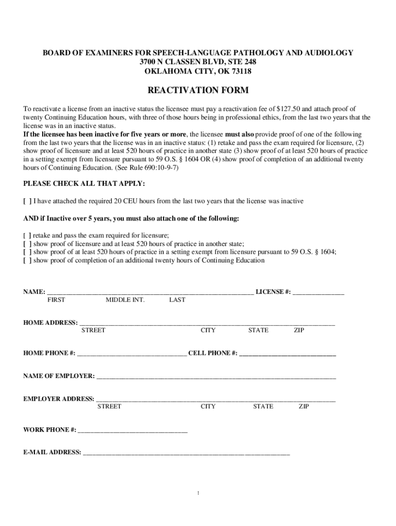 BOARD OF EXAMINERS FOR SPEECHLANGUAGE PATHOLOGY AND AUDIOLOGY 3700 N CLASSEN BLVD, STE 248 OKLAHOMA CITY, OK 73118REACTIVATION FORM To reactivate a license from an inactive status the licensee must