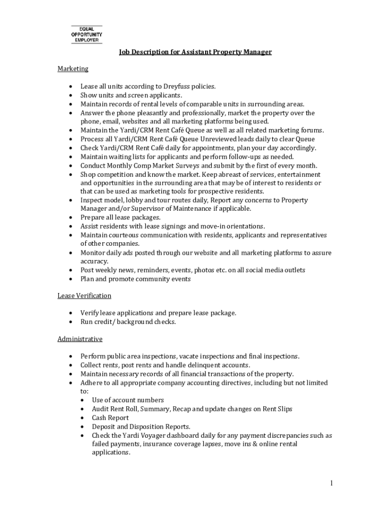 Job Description for Assistant Property Manager Marketing Lease all units according to Dreyfuss policies. Show units and screen applicants. Maintain records of rental levels of comparable units in