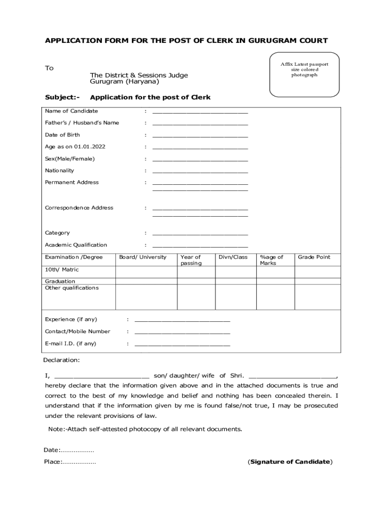 APPLICATION FORM FOR THE POST OF CLERK IN GURUGRAM COURTAffix Latest passport size colored photographTo The District & Sessions Judge Gurugram (Haryana) Subject:Application for the post of ClerkName