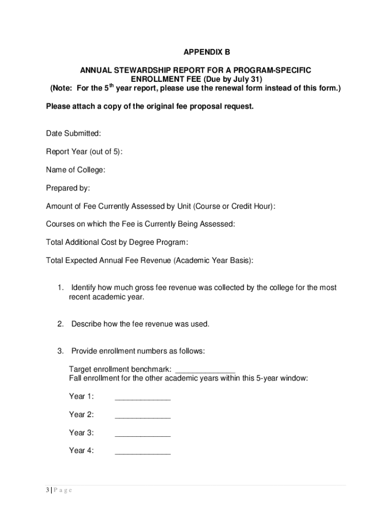 APPENDIX B ANNUAL STEWARDSHIP REPORT FOR A PROGRAMSPECIFIC ENROLLMENT FEE (Due by July 31) (Note: For the 5th year report, please use the renewal form instead of this form.) Please attach a copy of