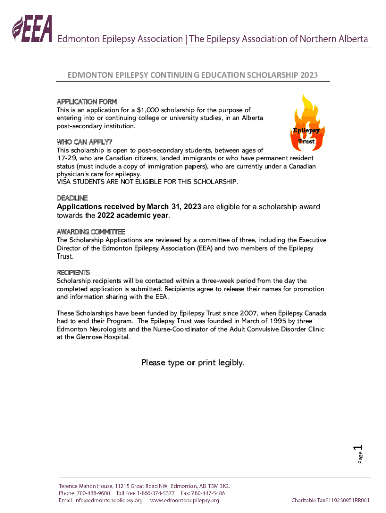 EDMONTON EPILEPSY CONTINUING EDUCATION SCHOLARSHIP 2023 APPLICATION FORM This is an application for a $1,000 scholarship for the purpose of entering into or continuing college or university studies,