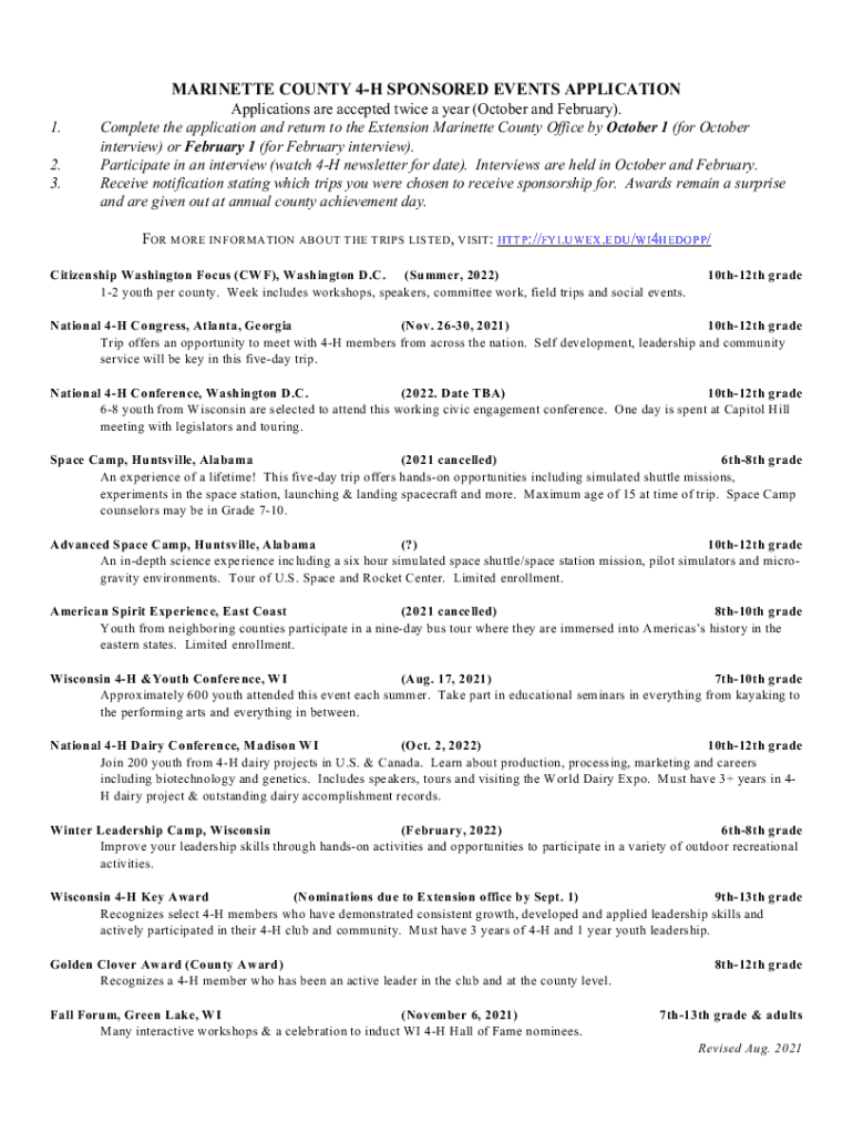 MARINETTE COUNTY 4H SPONSORED EVENTS APPLICATION 1. 2. 3.Applications are accepted twice a year (October and February). Complete the application and return to the Extension Marinette County Office