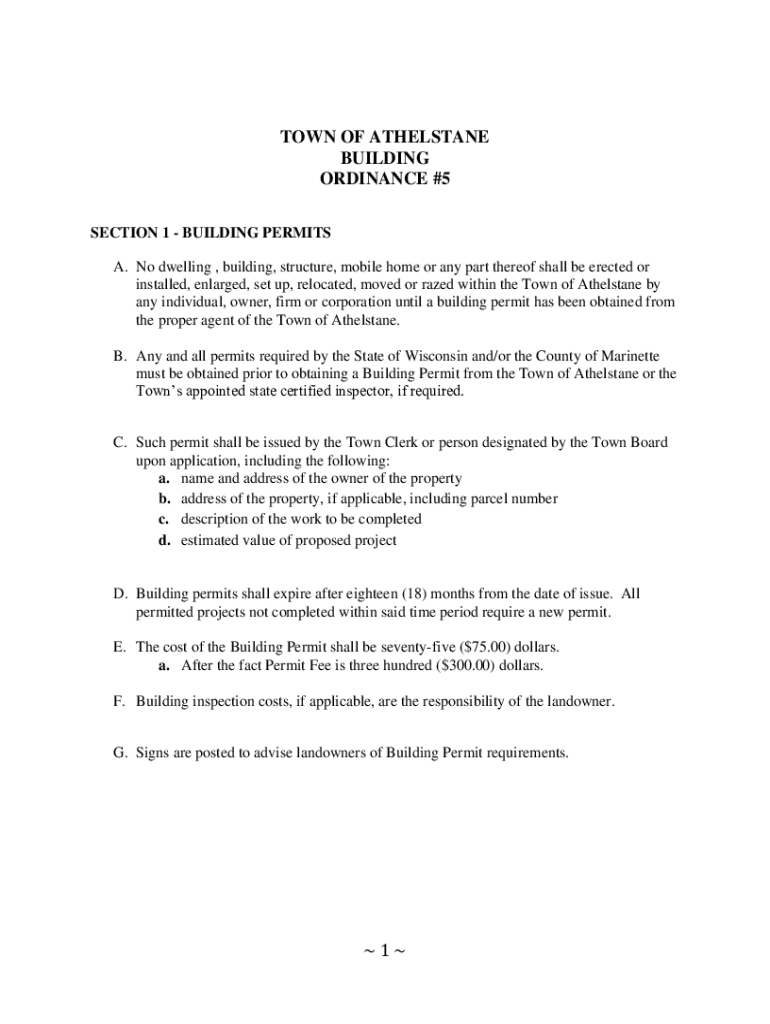 TOWN OF ATHELSTANE BUILDING ORDINANCE #5 SECTION 1 BUILDING PERMITS A. No dwelling , building, structure, mobile home or any part thereof shall be erected or installed, enlarged, set up, relocated,