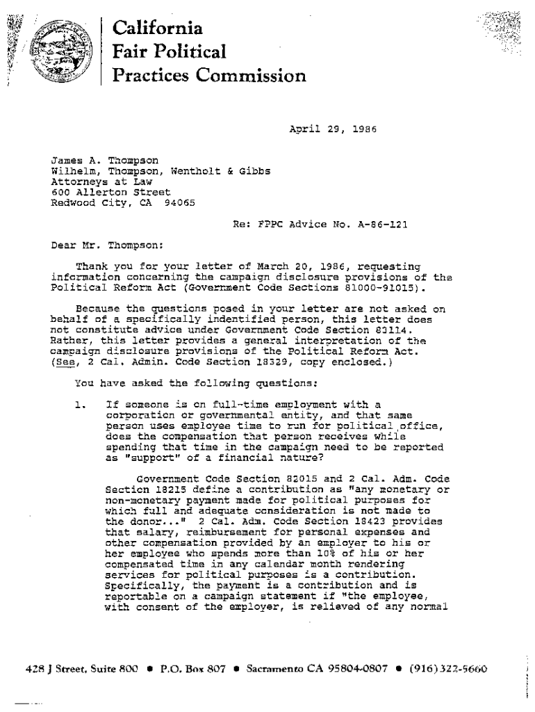California Fair Political Practices Commission April 29, 1986 James A. Thompson Wilhelm, Thompson, Wentholt & Gibbs Attorneys at Law 600 Allerton street Redwood City, CA 94065 Re: FPPC Advice No.