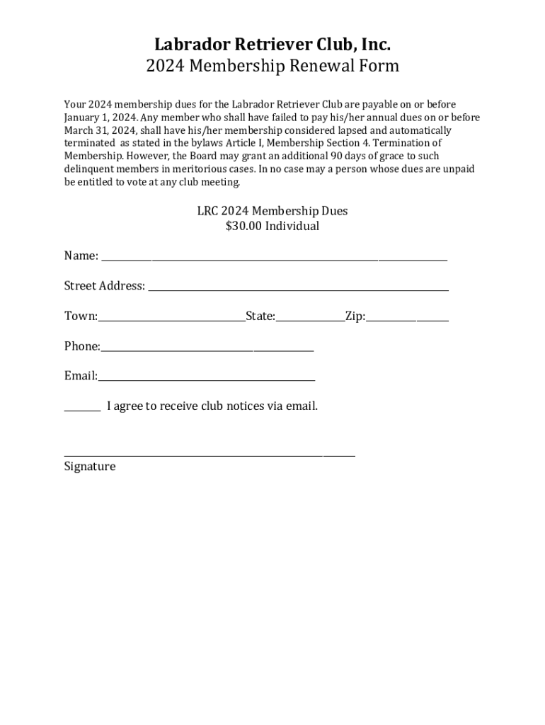 Labrador Retriever Club, Inc. 2024 Membership Renewal FormYour 2024 membership dues for the Labrador Retriever Club are payable on or before January 1, 2024. Any member who shall have failed to pay