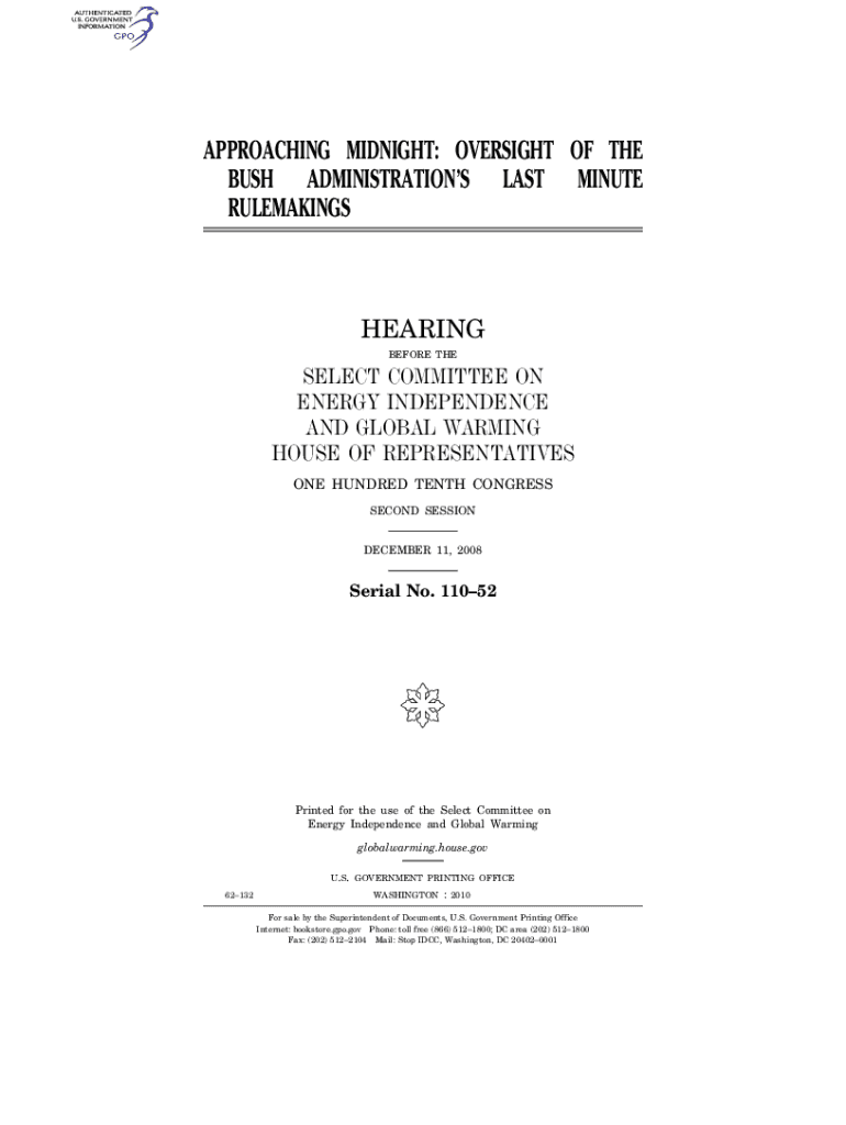 APPROACHING MIDNIGHT: OVERSIGHT OF THE BUSH ADMINISTRATIONS LAST MINUTE RULEMAKINGSHEARING BEFORE THESELECT COMMITTEE ON ENERGY INDEPENDENCE AND GLOBAL WARMING HOUSE OF REPRESENTATIVES ONE HUNDRED