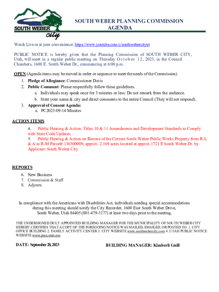AGENDA Watch Live or at your convenience: https://www.youtube.com/c/southwebercityut PUBLIC NOTICE is hereby given that the Planning Commission of SOUTH WEBER CITY, Utah, will meet in a regular public