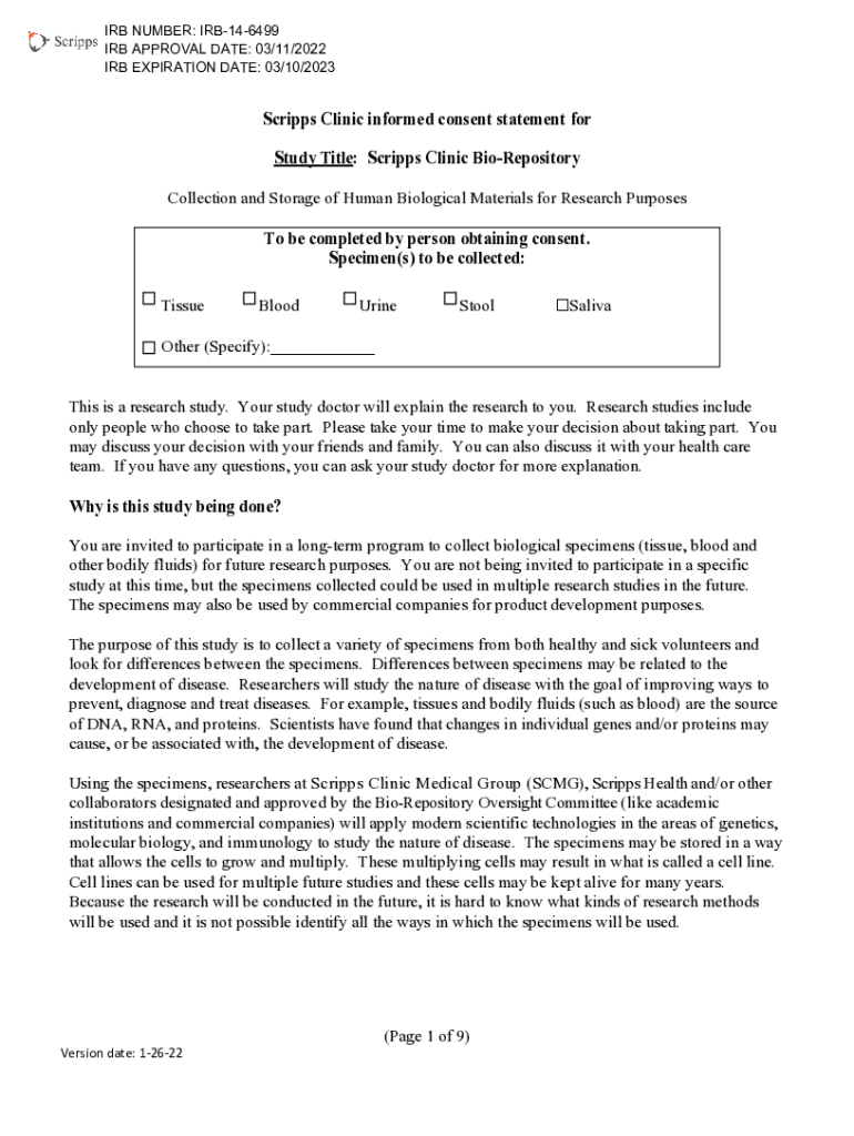IRB NUMBER: IRB146499 IRB APPROVAL DATE: 03/11/2022 IRB EXPIRATION DATE: 03/10/2023Scripps Clinic informed consent statement for Study Title: Scripps Clinic BioRepository Collection and Storage of