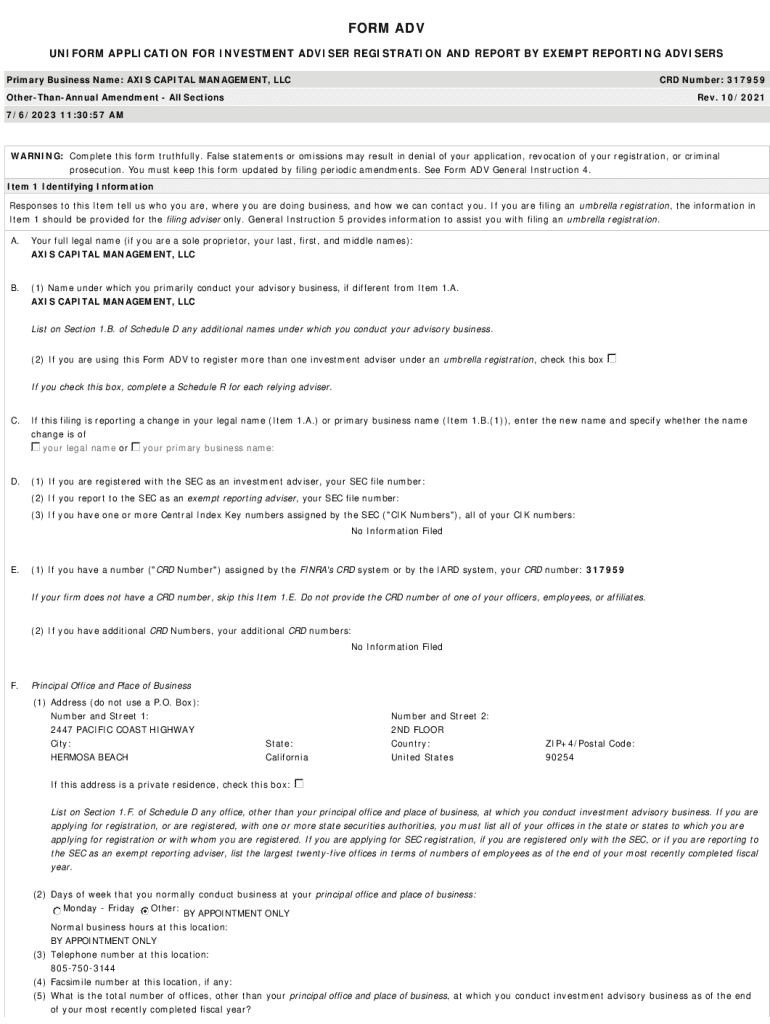 FORM ADV UNIFORM APPLICATION FOR INVESTMENT ADVISER REGISTRATION AND REPORT BY EXEMPT REPORTING ADVISERS Primary Business Name: AXIS CAPITAL MANAGEMENT, LLCCRD Number: 317959OtherThanAnnual Amendment